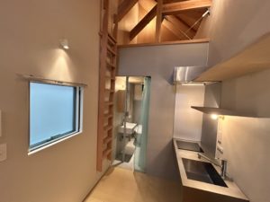 1階にはDKと水回り、2階には落ち着いたベッドスペースを配置。天井の高い吹き抜け構造と、ステッピングフロアで十分に広さを感じられます。備え付けのハシゴで行く納戸もギミック感があってちょっとテンションが上がります。また床下部分にも収納スペースがあり、家電やオフシーズンの服などもちゃんとしまっておけます。